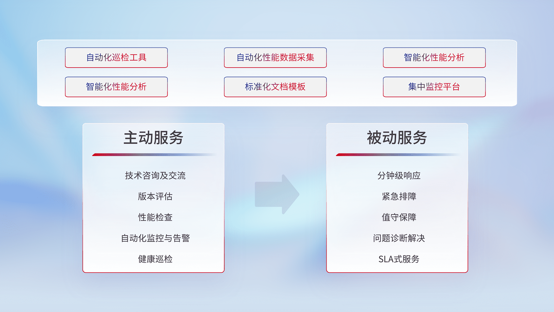 智能化工具和标准化文档,,,保障服务质量,,提供主动服务(包含技术咨询、、版本评估、、、、性能检查、、、自动化监控与告警、、、、健康巡检)和被动服务包含(分钟级响应、、紧急排障、、值守保障、、、、问题诊断解决、、SLA服务)。。